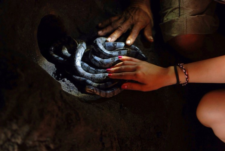 These are Holy Snakes. A Holy Snake is one legend in Tanah Lot Temple. People there believed that the snakes with white and black relief were to guard the Temple from the evil or bad things. You have to give some money in order to touch the snakes.