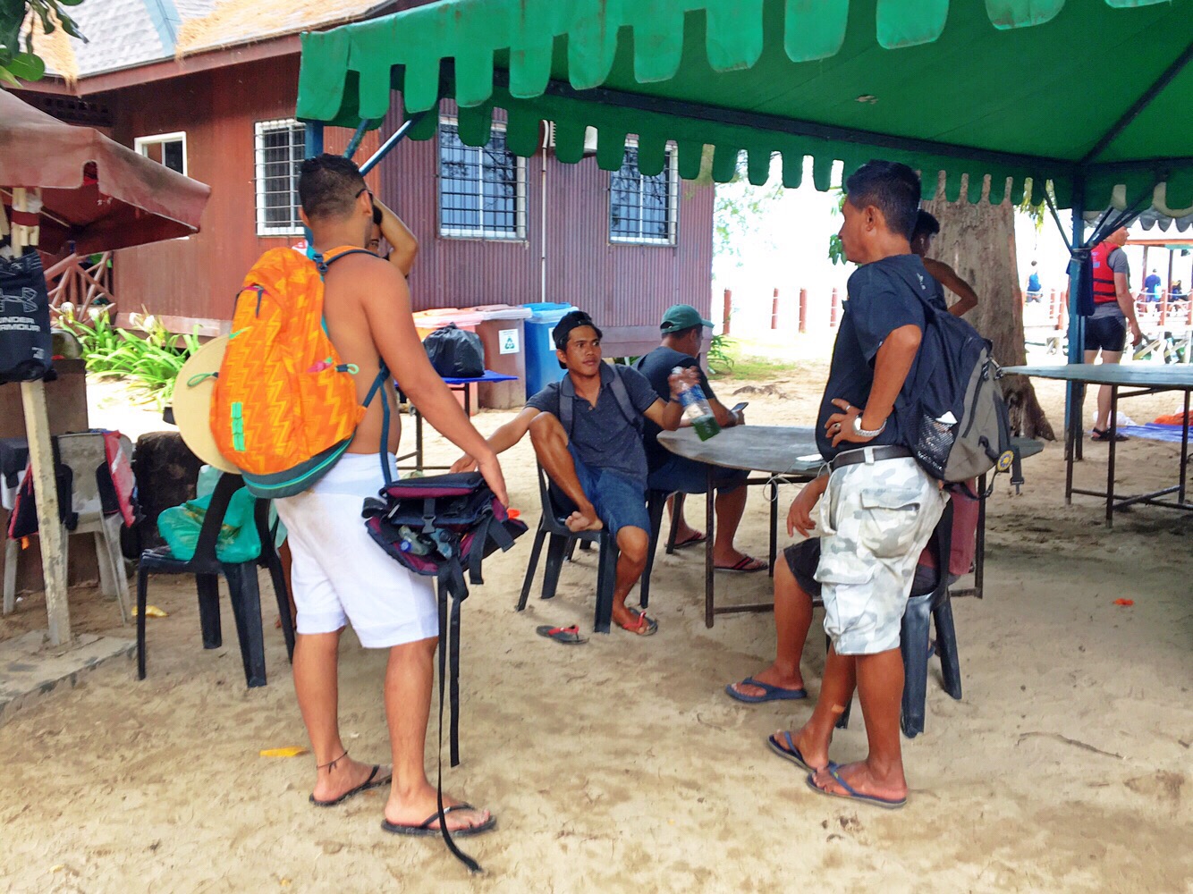 Around 4:00 PM, it started to rain. Boo! We had to fix our things and wait for the boat. Kaeser was chatting with some Filipinos there.