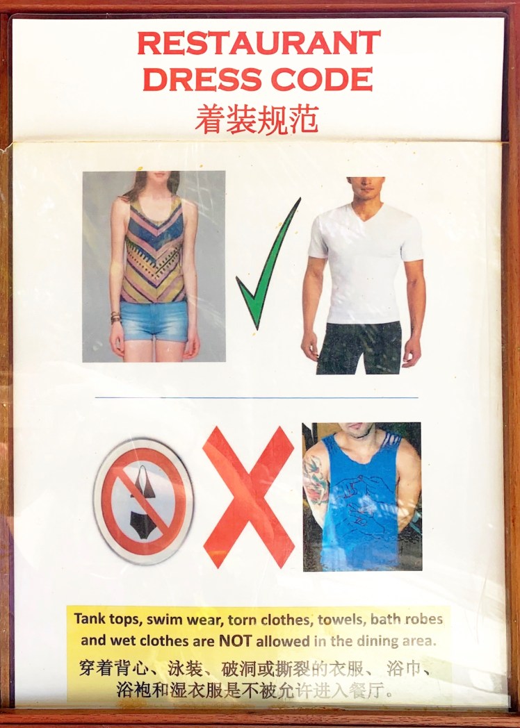 Before having lunch, we had to change clothes. Swimsuits are not allowed for women and sleeveless are not allowed for men. Also, you can’t enter the restaurant if your clothes are wet.