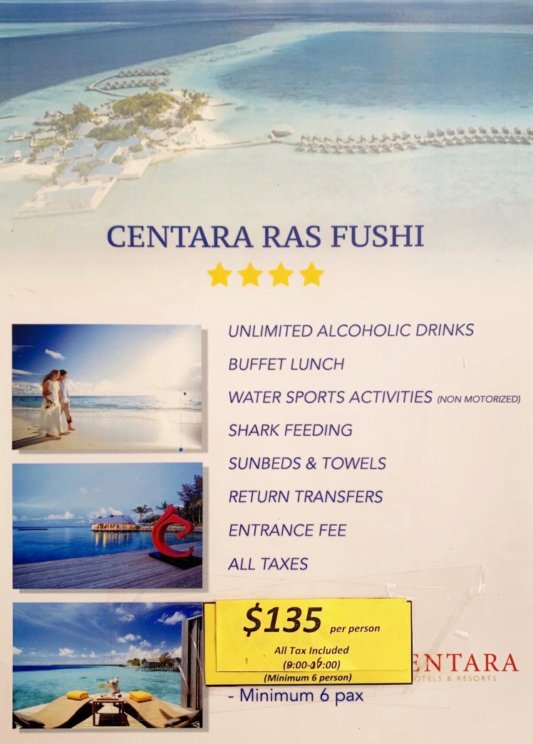 Maldives is known for their luxury resorts and water villas. This was one of the things I look forward to as well. Honestly, I cannot afford to pay $500 to $1500 to stay in a villa for a night. So, I did my research and found out that they accept day trips! I was giddy with excitement because I don’t have to pay that much! You just have to pick which resort you want to go, it ranges from $100 to $250 for a day trip depending on the resort. I chose Centara Ras Fushi because I think the price is just right with all the inclusions: