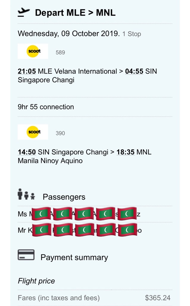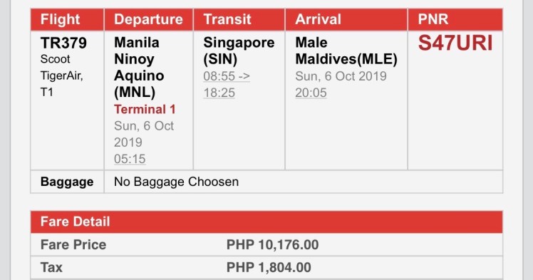 We got ours for PHP 15,388 per person because we weren’t able to catch a seat sale for both ways. Both were booked via Skyscanner with Scoot airlines. MNL-MLE was booked almost a year before our flight, which was November 2018, and we booked the MLE-MNL last July 2019. See below: