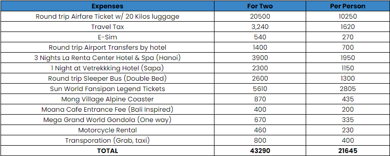 Here are our actual expenses. Please note that we booked our airfare only a month before our travel date, which is why it was quite expensive. You can find round trip airfare tickets for as low as PHP 3,000 during seat sales.
